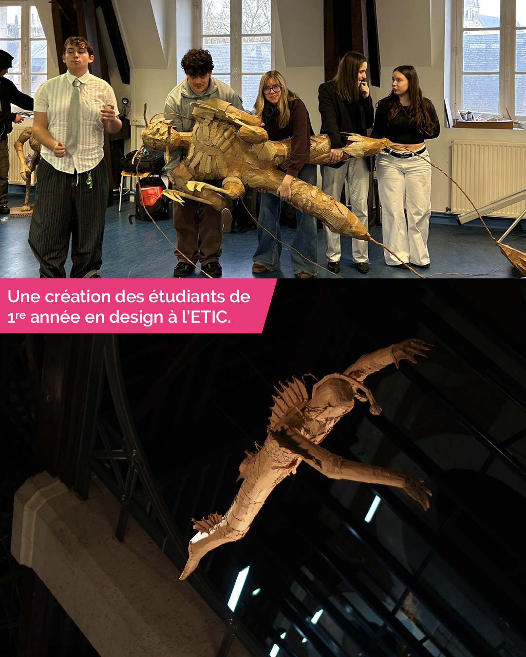 L’objectif de ce projet était d’interroger notre rapport au vivant à travers une création plastique et narrative. En ateliers, les étudiant·e·s ont imaginé et réalisé des personnages hybrides, mi‑humains, mi‑animaux, utilisant le carton comme matière principale. Chaque volume est ainsi porteur de sa propre histoire : il questionne notre manière de percevoir notre corps, notre environnement et notre place parmi les autres espèces.